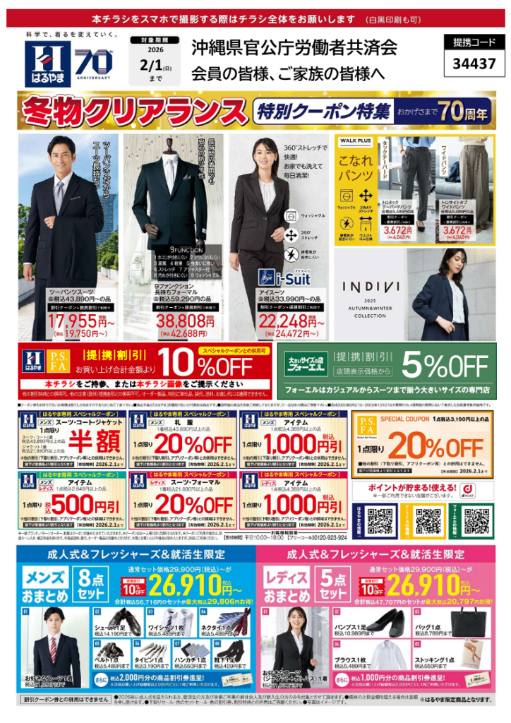 今回の優待登録に伴い、スーツ・コート・ジャケットが半額になるスペシャルクーポンをご用意頂いています!(諸条件あり)