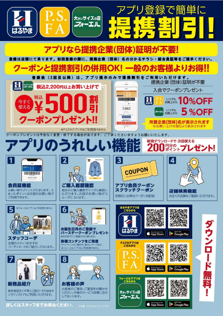 全国の「はるやま」「P.SFA」「フォーエル」でKカード優待が使えるようになりました!
