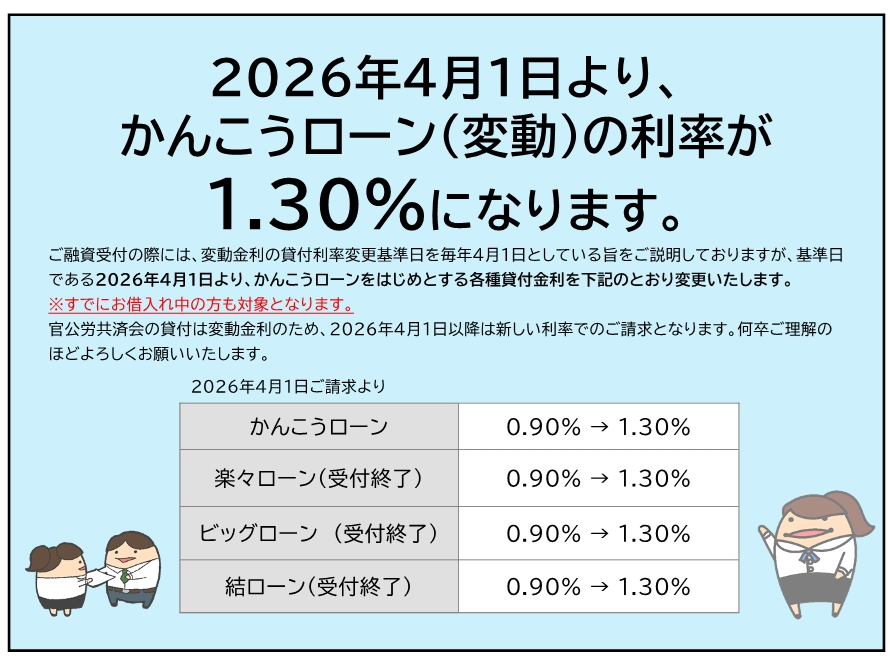 このたび、2026年4月より、かんこうローンを含む各種貸付の金利を年1.30%に改定いたします。